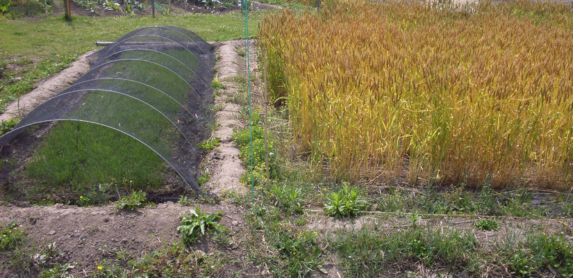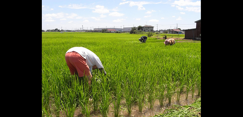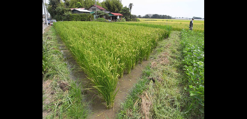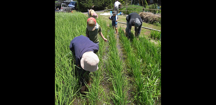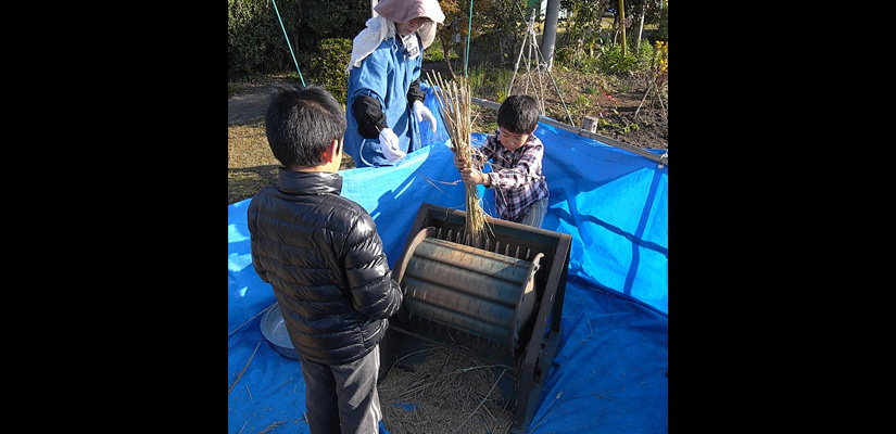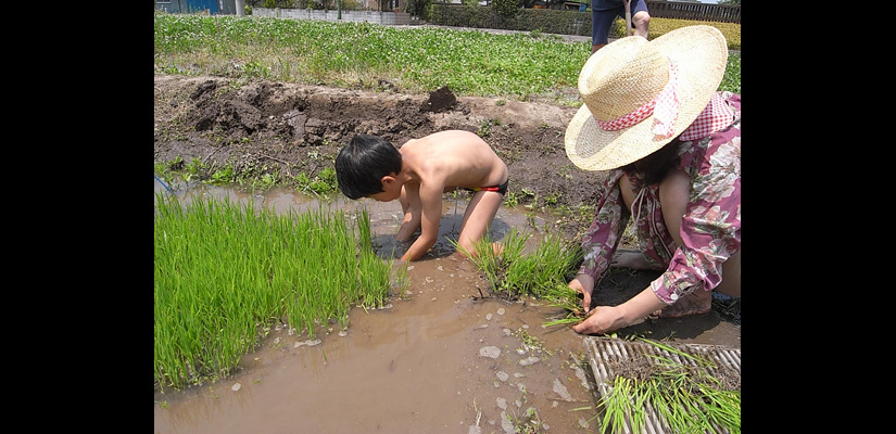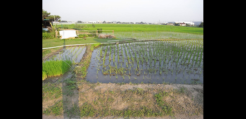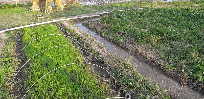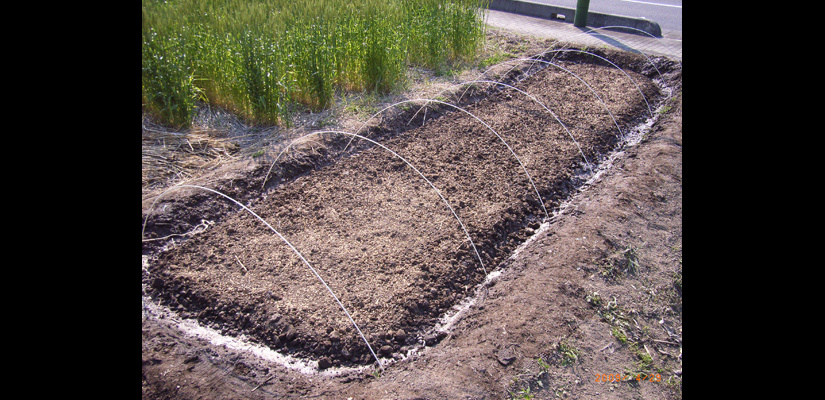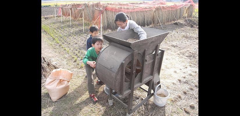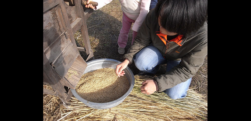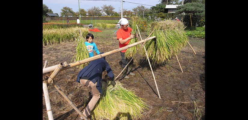 4/29 キヌヒカリの種籾 4/29 畑苗代に種籾を播く。根をしっかり張らせるため畑にて芽出しを行う。 5/29 苗が育ってく頃、麦は収穫時を迎える。 6/6 麦刈り終了。植えてあったクローバーが現れる。苗は150ミリ程までに成長。 6/12 畔を補修。 6/12 畑苗代に水を入れて苗を掘り起こす。 6/13 ローバの間に苗を植えていく。 6/24 水田に水を引き込むとクローバーは水没し枯れて緑肥になる。 7/18 雑草とり。苗の成長と共に雑草も育つので、丸めて土の中へ押し込んでいく。 7/18 雑草とり。稲の分けつも盛んに。 8/29 出穂が始まる。 9/19 穂に身が入り始め、稲穂が垂れてくる。 10/16 稲を刈り、はさに掛けして天日干しする。 11/21 足踏み脱穀機を用い、2週間程かけて脱穀終了。 11/21 唐箕(とうみ)をかけて軽いゴミを飛ばし籾を取り出す。 11/26 唐箕で選別したお米。種籾状態で常温保存し食べる時に都度精米する。 アーキファーム難波田 2008年より自然農法にトライしている水田です。前年に収穫した種籾を畑苗代で育て、緑肥となるクローバーの中に苗を直植えたりしています。キヌヒカリと古代米(黒米、赤米、緑米)を田植えしました。詳細は下記へhttp://www.toziba.net/daizu_revo/hatake/2010/1478/*小さな大豆畑部分は2010年から『大豆レボリューション』NPO法人トージバのテイケイ畑になりました。