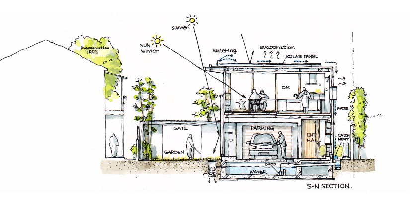 特にエネルギーを消費しない雨水は、必要な時に散水することで冷房負荷を抑えてくれると共に、デッキに水を貯めれば、涼感や視覚的な優雅さをもたらしてくれる。この地に於いて一番の恵みである雨と太陽にあやかった家である。