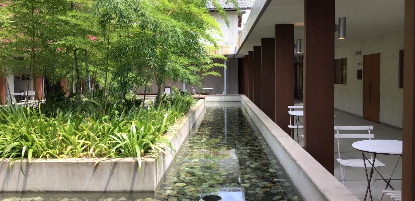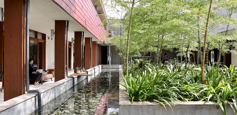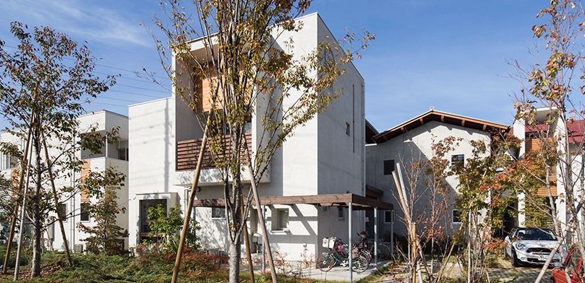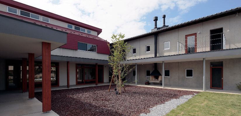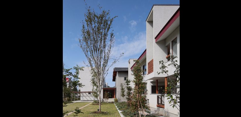 緑に囲まれた建物群、中庭、軒下回廊、カフェ、スタジオ、工房、暖炉などの共有空間があり、使い方は住む人次第。関わり方も様々。