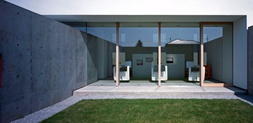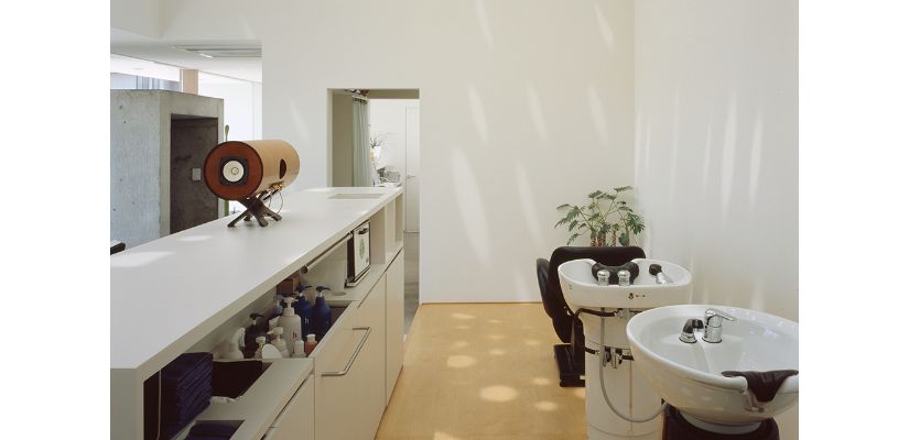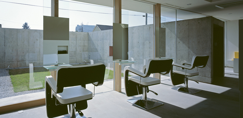 終日、美容室店内で過ごす夫婦の希望は、「屋内に居ながらにして季節や天候等の環境変化を感じられるリビングのような空間」であった。計画にあたり課題となったのは、厳しい北関東の自然環境に対して、シェルターとしての機能を維持しながら、如何にして外の環境変化を取り込むかであった。