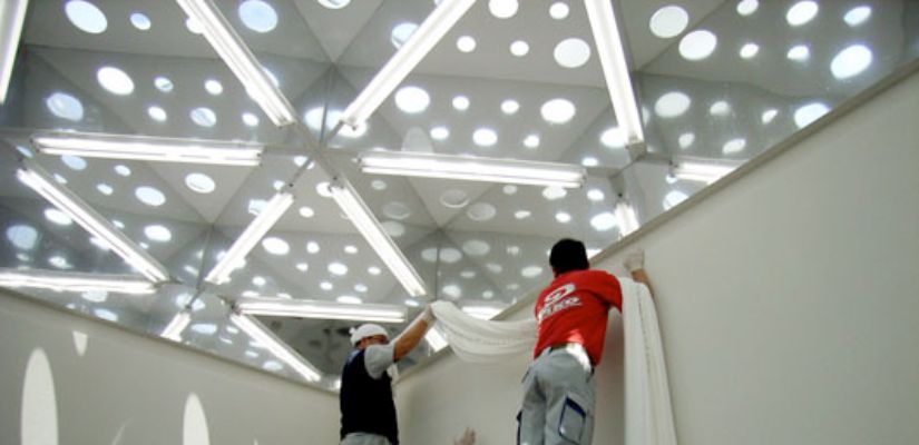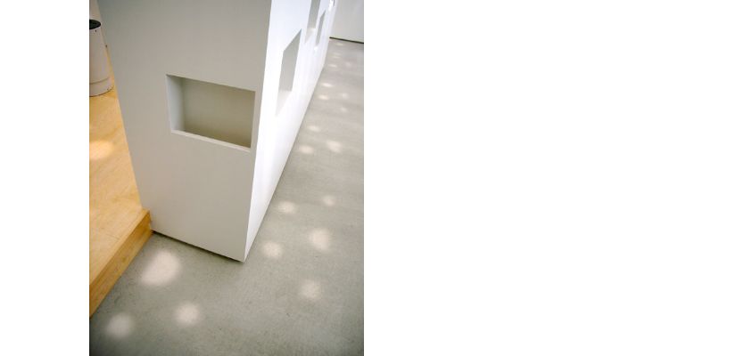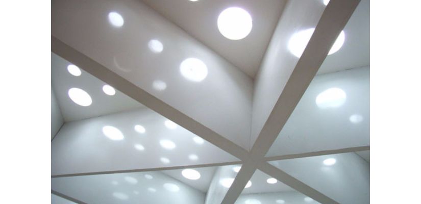 思考の末、提案したのは、季節・時間で移動する太陽に呼応し膜天井に光を映すシステムである。トップライト下の穴空きボードにより円形にカットされた光は格子梁の側面に貼られた鏡に反射し、太陽の移動に呼応して膜天井や壁の上を形を変えながら移行する。