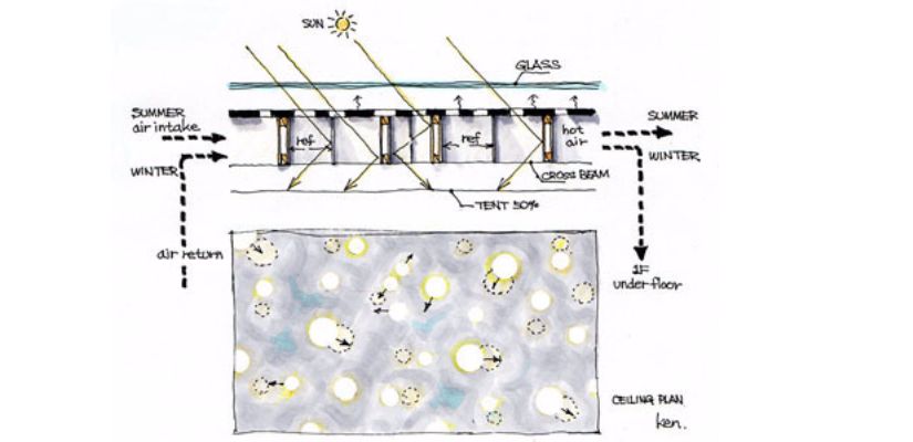 また、この天井システムは空調スペースとして機能し、寒暖差の厳しい外部環境とのバッファーゾンとして、季節毎に室内の熱環境を調整している。